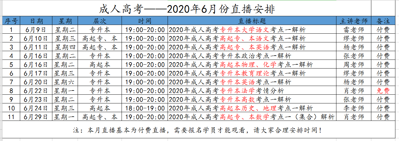 2020年6月云南成人高考直播課程安排(含免費課程)