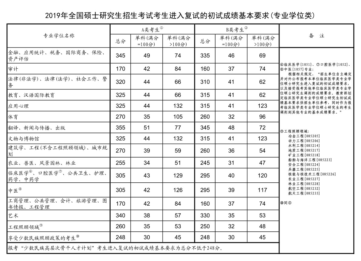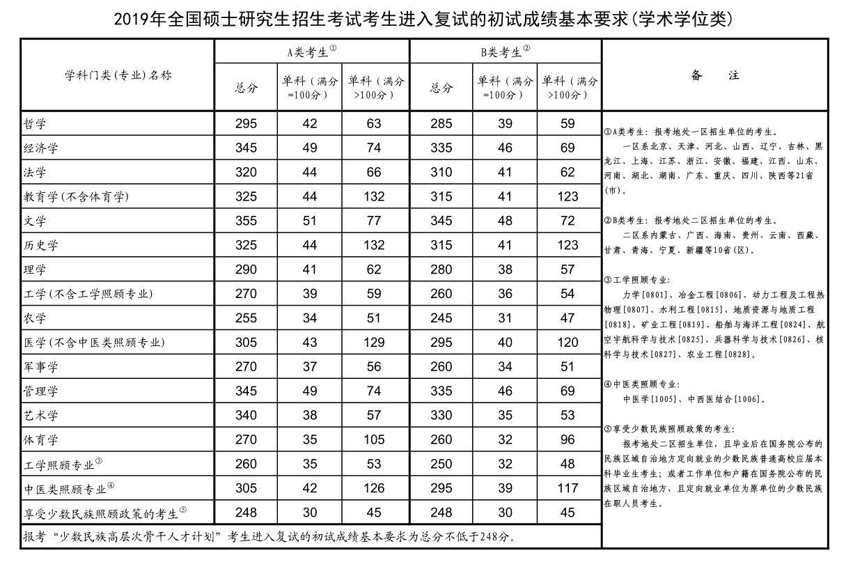 2019年全國碩士研究生招生考試考生進入復試的初試成績基本要求