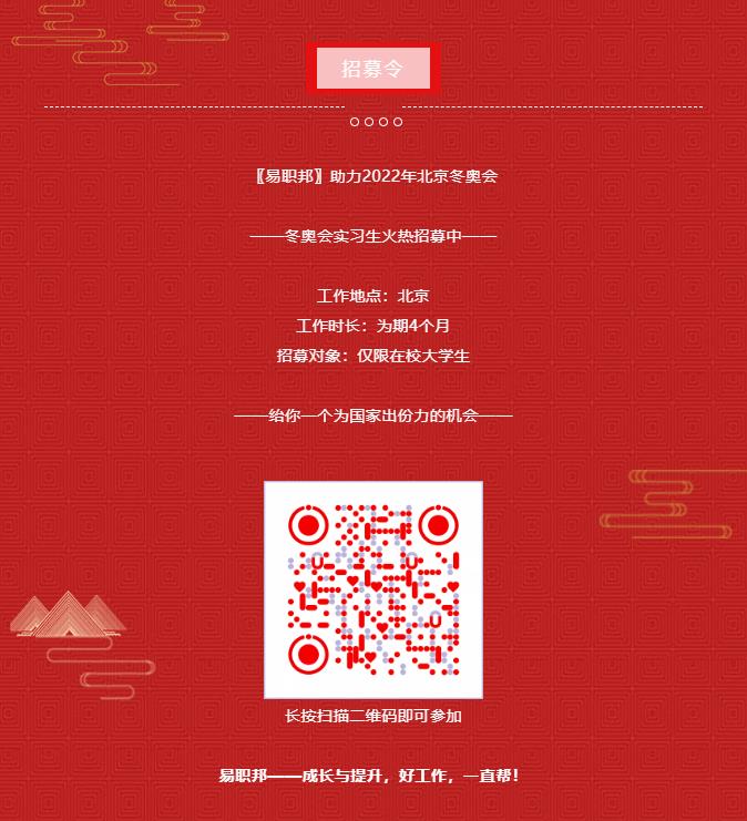 此次易職邦有幸承接冬奧會實習生招募工作,我們期待與58魔方以及廣大莘莘學子一起為2022北京冬奧會獻上一個完美的答卷,共同助力冬奧會順利召開!